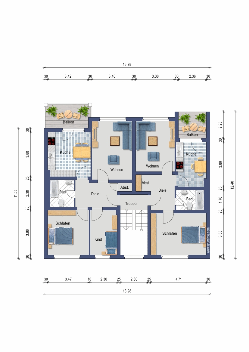 Die Erdgeschosswohnungen verfügen über eine Terrasse sowie einen eigenen Garten. Die Wohnungen im 1.OG und 2.OG verfügen ebenfalls über Balkone.